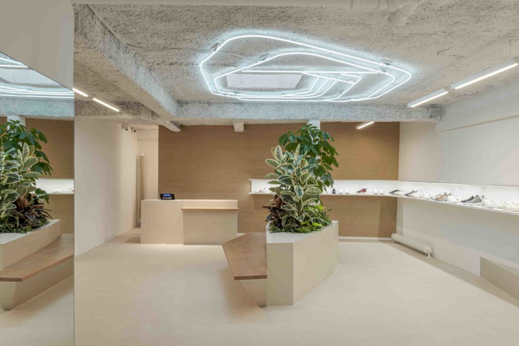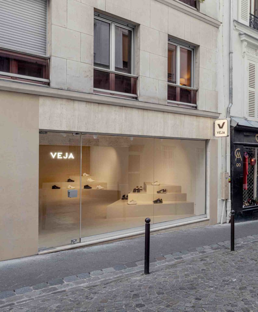 Veja strijkt neer in het vroegere pand van conceptstore Spree aan de Rue la Vieuville. Het merk schakelde de Franse architect Hugo Haas in voor het interieur, waarbij de mix van hout en beton centraal staat. Haas keek voor inspiratie naar de architectuur van São Paulo uit de jaren ’70. Het is geen toeval dat hij bij Brazilië uitkwam; Veja sourcet en produceert hier het grootste deel van zijn collecties.